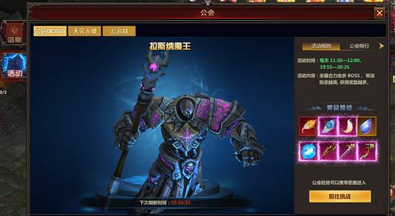 每天11:30—12:30;19:55—20:25定时刷新,在boss刷新后前往公会驻地参与活动