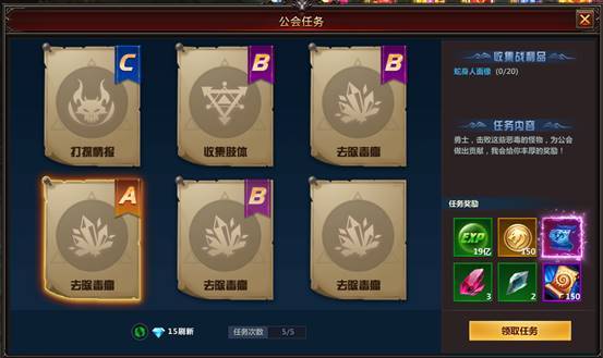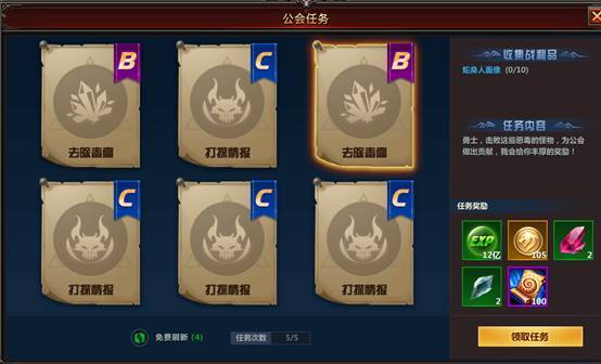 点击公会任务。可选择不同评价等级的任务经常完成,不同评价的任务奖励不同,评价越高任务奖励越好。