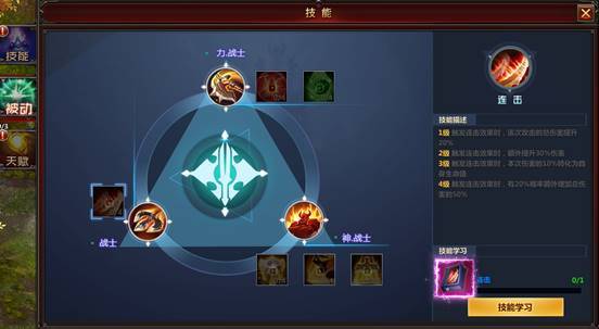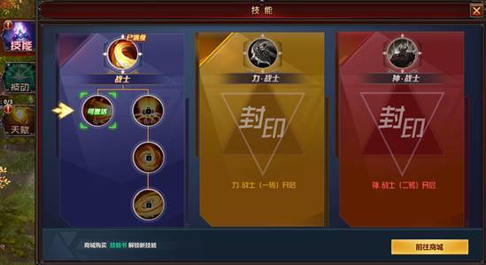 战士被动技能为连击,连击技能可以在角色到达120级后商城购买。力·战士被动技能为流血、恢复。流血、恢复技能可以在角色一转并且150级在商城中购买。神·战士被动技能为格挡、斩杀、罡气,格挡、斩杀、罡气技能可以在角色二装并且205级在商城中购买。所有被动技能激活时,都需要指定的技能书才可激活,所有被动技能满级为4级,可以通过技能升级书升级角色被动技能。(技能升级书可以通过日常任务中的暮光远征获得。)